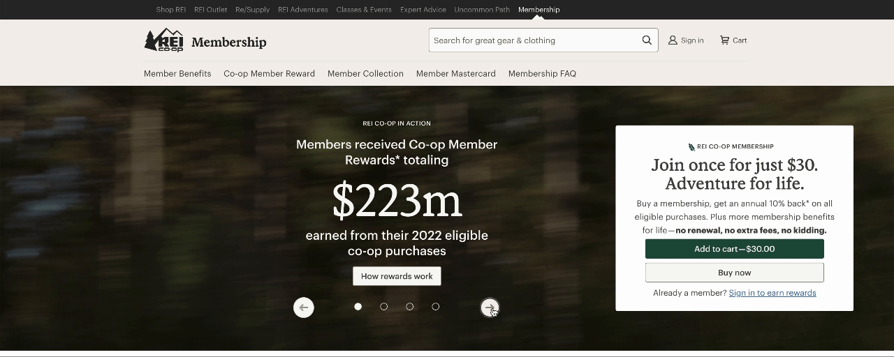 Our hypothesis was that by emphasizing key messages like "one-time cost" and "lifetime membership," we could clarify the value proposition and improve membership conversions. Many customers are unaware that an REI membership is a one-time payment of $30, so our aim was to reinforce this messaging in the headline and body copy.